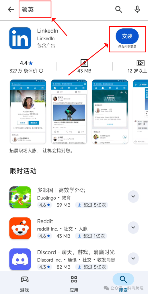 1.打开Google Play商店,搜索“LinkedIn/领英”下载;
