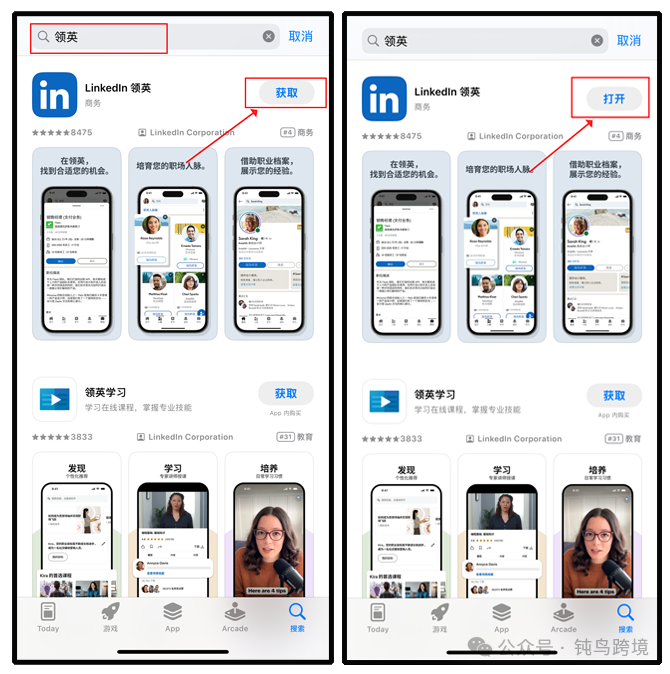 1.打开APP Store,搜索“LinkedIn/领英”,点击获取,下载完成后打开;