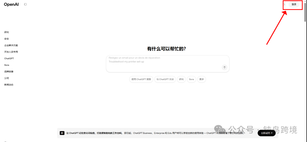 - 打开浏览器,网址搜索栏输入chatgpt官网,点击右上角的登录